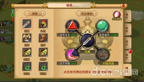 当主公官职到达一定程度时即可开启镶嵌,镶嵌可以提升主公属性,镶嵌开启后首先开启三个镶嵌槽,暴击镶嵌槽需要55级才可以开启。宝石可以通过合成来升级,等级越高的宝石提升的属性越多,并且宝石拥有套装属性。