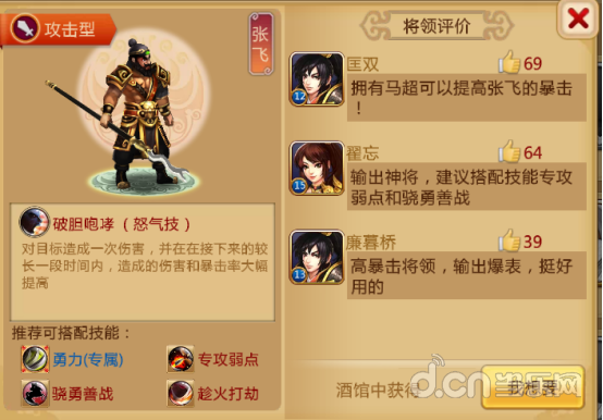 第一:当然是张飞(张三哥),属于高爆发武将,专属技能破胆咆哮,单体高爆发的技能,可以说是输出神技,配合技能越战越勇,专攻弱点,令人闻风丧胆