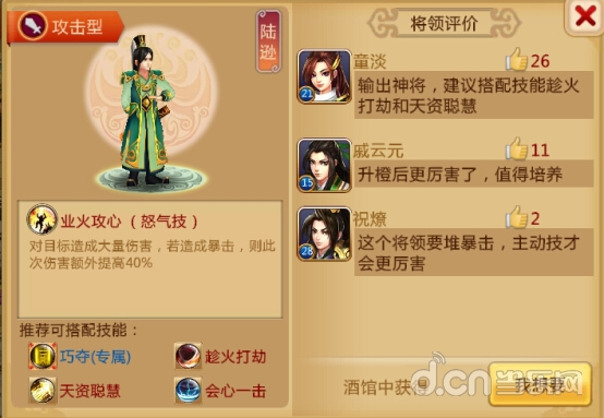 第二:宝宝心目中当属陆逊陆老师,同样的单体高爆发,可以说放到队伍里面,非常的有威慑力,建议搭配技能,乘火打劫和天资聪慧。