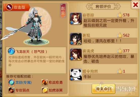 第三:宝宝推荐攻击和防御均衡的万金油的武将放前排,赵云赵子龙是不二人选,6元首冲礼包所获武将,造型霸气,实力非凡,是新手玩家必用武将VIP1到VIP8礼包都有赵云培养材料,可以轻松上三星,可以做为输出也可以做半肉半输出。