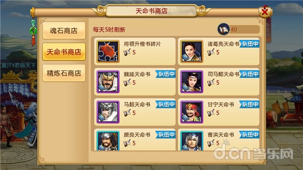 除了活动会送外,我们还能在商店里通过消耗5个天书残页兑换1个碎片,而天书残页则可以通过分解将领天命书获得。将领天命书又能通过将领魂石合成。所以一整套流程就是:获得魂石→合成天命书→分解为天书残页→兑换升橙书碎片。