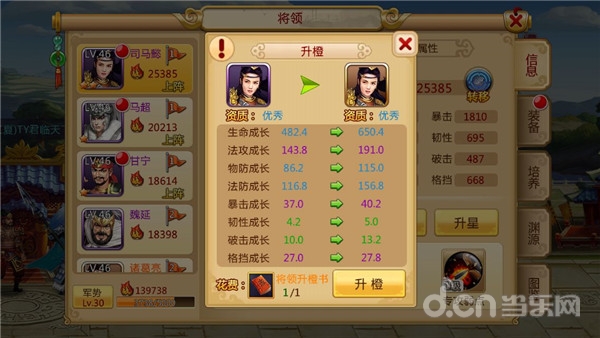 以上是紫将升橙和蓝将升橙的对比图,不难发现,由于紫将初始能力较高,因此在升橙后,属性提升并没有蓝将升橙高,因此无论是什么品质的将领,在升橙后其属性是相差无几的。