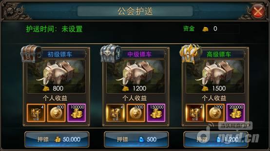 护送活动开启时间由会长决定,每日在18点~21点之间护送奖励翻倍。护送活动目前在野外1图开启,行进路线也仅在野外1图。后续版本会开发跨地图的路线更长的护送。公会会长选择护送镖车的等级,普通镖车需要事先交付押金,中高级镖车需要抵押钻石才可押运。每天会长都需要选择一次镖车的等级,否则活动无法开启,时间可以不调整。在地图中有大量强力敌人阻拦在行进路线上,这些怪物实力平平,数量却极为众多,会对镖车行进造成棘手麻烦。