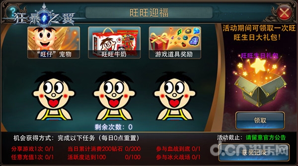 随着《狂暴之翼》全新版本的上线,备受玩家期待的 “旺旺迎福”活动隆重开启。玩家只需参与完成血战到底、冰火战场等指定任务,即可获得游戏机会。轻松一点,各种游戏资源喜从天降,更有几率得到橙宠旺仔和旺仔牛奶的实物奖品。完成的游戏任务越多,参与次数也越多,一起high起来吧!