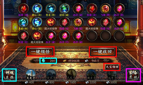 ②、点击【一键收回】可将灵珠塔内获取的灵珠收入灵珠背包中,通过【装备灵珠】可进入灵珠包裹装备灵珠或升级已镶嵌灵珠。
