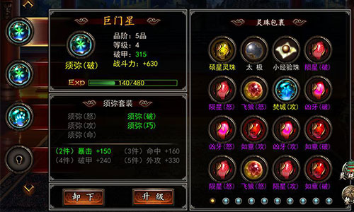 目前灵珠主要分为5个品阶,1-5品的颜色分别为:白-绿-蓝-紫-金,品阶越高,灵珠本身的基础属性越高;相同名称不同类型的灵珠可组成套装,额外增加套装属性。
