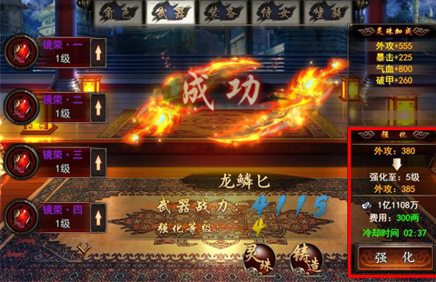 注:强化仅需消耗银两,强化成功率为100%,每强化一次会增加一定冷却时间,当冷却时间达到30分钟时,无法再次强化,可使用元宝清除冷却时间。