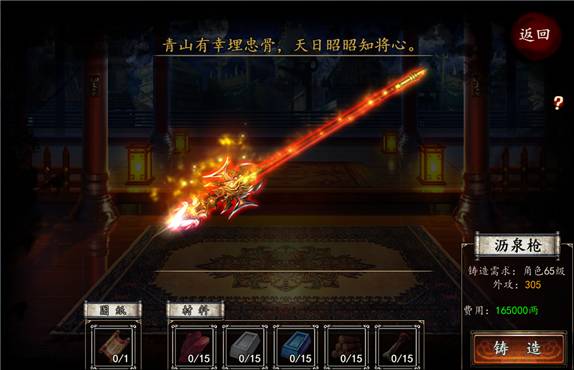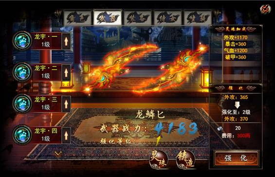每个职业的的武器分0-6个阶段。一共7个武器进化阶段。在每次进阶锻造,可改变武器的外形,继承了历史武侠中的剑在人在等说法。专属的打造一般属于自己的武器。