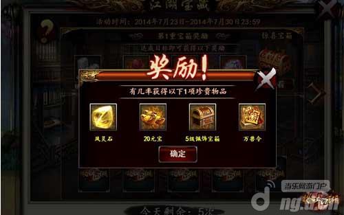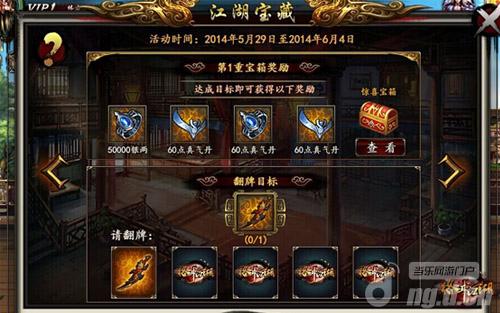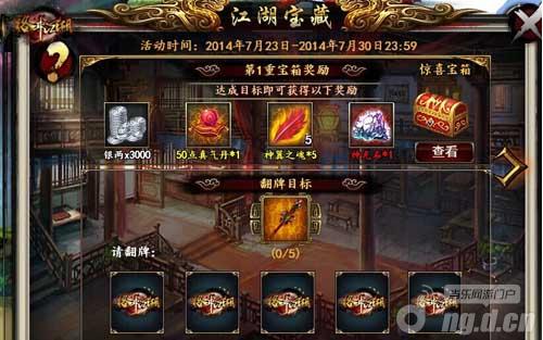而咱们《格斗江湖》江湖宝藏活动是开放给30级或以上的玩家的,所以想淘宝,就得先看看自己够不够资格咯。而在活动开放期间内,每日翻牌次数为5次,当然,土豪玩家可以消耗10元宝再翻一张牌。