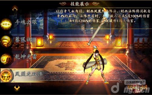 凤烈无双阵:以自身气血生成凤凰烈焰阵法,消耗自身4%的气血,对敌人造成5段100%的伤害和1段1200%的伤害。