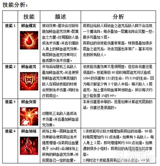 特点:传奇英雄,超强的魔法输出型英雄,同时HP回复能力非常强。站位很靠前,虽然是中排英雄,但比前排的才藏站的还靠前,实际上她的HP上限、护甲和魔抗都很高,相当于一个小坦克,这三个属性甚至比才藏还有优秀一些,所以有时可以直接用她来做坦克。莉莉丝没有控制能力,所以这点上不如黑暗圣徒或原力剑圣,总之可以将莉莉丝理解为一个法系航母,法坦什么的。