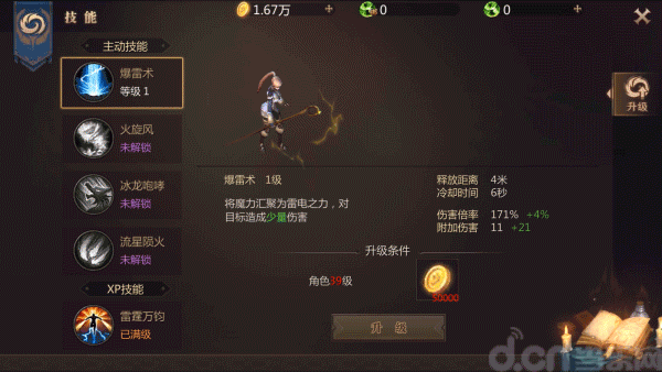 技能介绍:将魔力汇聚为雷电之力,对目标造成少量伤害,释放距离4米,冷却6秒。
