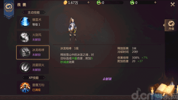 技能介绍:释放雪山中的冰龙之魂,对目标造成中量伤害,附加减速效果。释放距离3米,冷却20秒。