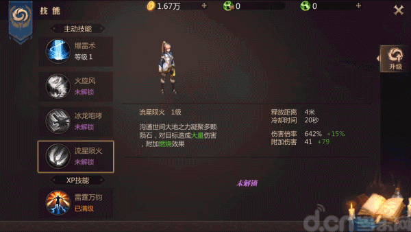 技能介绍:沟通世间大地之力凝聚多颗陨石,对目标造成大量伤害,附加燃烧效果。释放距离4米,冷却时间20秒。