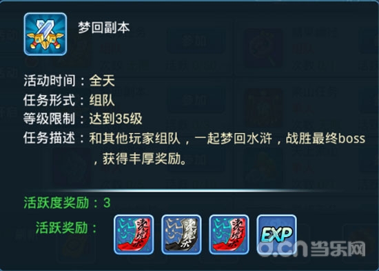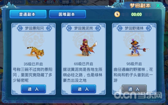 梦回副本是35级开启的,组队副本之一,梦回副本分为普通和困难两个级别,虽说只有2个级别,但难度还是差别挺大的。副本按等级又分为3个级别,分别是35级梦回景阳冈,65级梦回黄泥岗,95级梦回野猪林,同一副本,每天首次通关才有奖励,24点重置副本。这次我们先来看看35级梦回景阳冈副本。