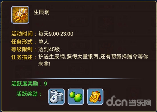 生辰纲在人物达到45级时开启,属于单人玩法,注意这个活动是限时活动哦,每天早上9点到晚上11点可进行。副本奖励:银两,宠物升级材料,帮派捐献令。