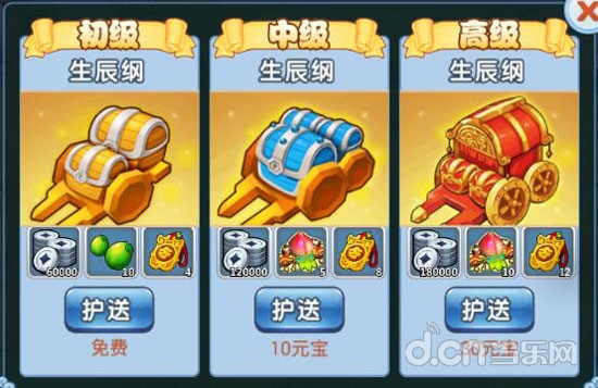生辰纲根据执行条件分为3个等级,各个等级的奖励不一样,持续的时间也不一样。