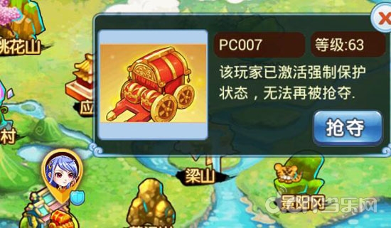 另外,护送的时候最多能被玩家抢劫2次,可以用自己小号抢,或者叫朋友降低实力来抢,消耗掉被抢次数,2次之后系统会激活强制保护,这时候只能被小怪抢,不能被别的玩家抢。