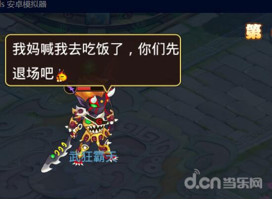 这次我们先来道开胃菜,武狂霸天是帮派BOSS活动的第一位boss,生命值达到了500K,技能特点是输出高,6的倍数回合会施放群秒技能,此时它会调皮的喊一句“妈叫我去吃饭”,然后秒掉对手自己吃饭去了。