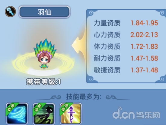 达到充值一定额度后赠送—羽仙,必带技能群法风兮云卷破、高级圣灵、疾风突进。
