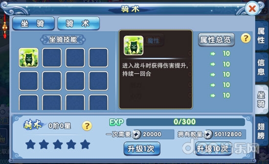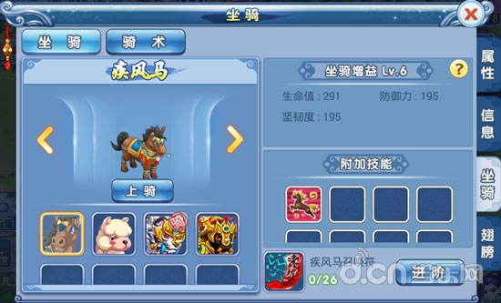 骑术不仅包括坐骑技能和骑术属性,还能看到坐骑给角色带来的总属性。骑术越高,坐骑技能等级越高。骑术每升一阶,坐骑技能等级就升1级,坐骑等级越高,该技能在战斗时给主角提供的帮主越大。
