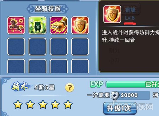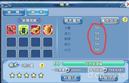 骑术越高,角色得到的骑术属性越高。初始0阶1星力量、体力、敏捷、耐心和心力都+10,之后一直到到3阶4星,每升1星各属性+1,从3阶5星到5阶5星,每升一星各属性+2,骑术最高5阶5星,所以在坐骑升阶和升星的时候就能增加很多属性,最终能有每个属性50点的收益。缺少银两的玩家,首先潜修0阶1星是最划算的,毕竟只需要30w即可给主角带来各属性加10的永久加成。