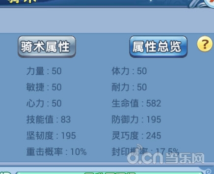 属性总览可以看到坐骑增益和骑术属性加成到主角身上的总属性。
