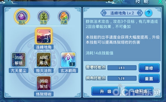 【连峰地角】、【玄冰箭雨】最多攻击目标为3个,【炼狱熔岩】、【亢天星尘】随着升到8、15、20级,攻击目标分别为4、5、6个。而且,后两个技能的等级不能高于前两个技能的等级。所以,当选定其中一种加点方向后,两个技能就要同步升级。