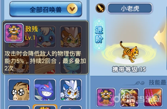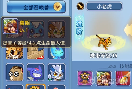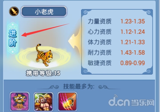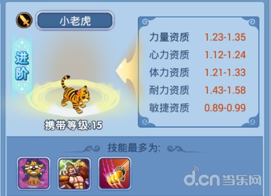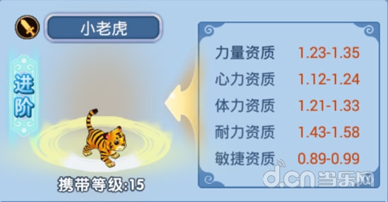前面的朋友,山顶的朋友,你们发现没有,这货居然是可以进阶的,surprise有木有~进阶可以提高宠召唤兽的资质上限,下面来看看小老虎进阶会成什么样~~