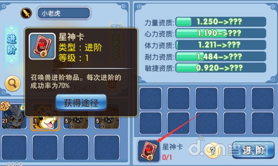 打开召唤兽界面,选中小老虎,再点击右边的“进阶按钮”,就进入进阶界面了,进阶需要1张星神卡,目前星神卡的获取方式是商城购买。另外小老虎可以进阶一次(进阶成功的话),进阶成功率为70%,还算是小坑哈~