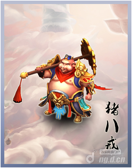 【猪八戒】本是天庭里主管天河的天蓬元帅,即使被贬下凡实力也未减多少,不仅拥有超强的生命值和韧性,还能用肚皮将敌方的伤害按比例反弹回去。平时虽然懒散偷闲,一旦发起怒来,也能用钉耙攻击敌方横排,威力惊人。
