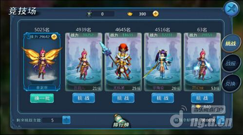 最左侧是玩家本人的人物角色及其排名战斗力,下方的换一批按钮,可以随机替换右侧的竞技场对手。竞技场对手的排列是有规律的,从左到右前三位的排名比你略高,第四位则是排名比你高很多的对手。点击挑战即可与对应的玩家进行战斗。战斗胜利将会得到对方的竞技场排名,还会额外获得荣誉点。荣誉点可以用来兑换稀有神将碎片,宝石,升星材料等珍贵道具。排名进前1000打败对手更会有元宝奖励。