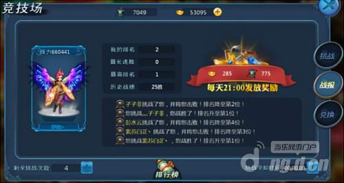 每晚九点将会根据玩家排名发放排名奖励,随着排名的上升,奖励将越来越丰厚。建议玩家在21:00前快速挑战,提高竞技场排名,获取每日结算奖励。