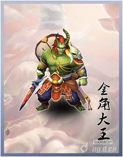 【金角大王】原是太上老君看守金炉的童子,在天界已久,见多识广。阅历广博使得同样的招式无法对他作用两次……额,错了,是他有很强的化解敌人攻击的能力,用来保护队友真是再好也不过了。