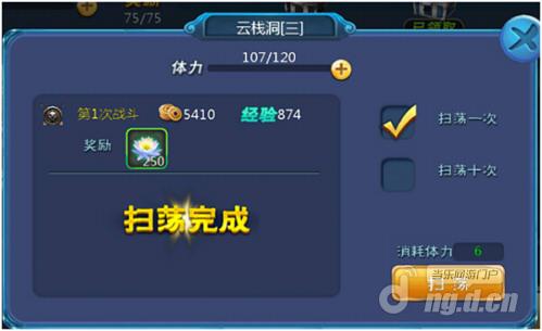 还记得之前所通关的高老庄后院主线么?放弃继续主线升级的心思吧,回过头去,扫荡这个关卡吧,每扫荡10次 你就能获得7780点经验,48150个铜钱。基本上在第二天用完120体力就可以达到30级,扫荡到的碎片也可以存起来。