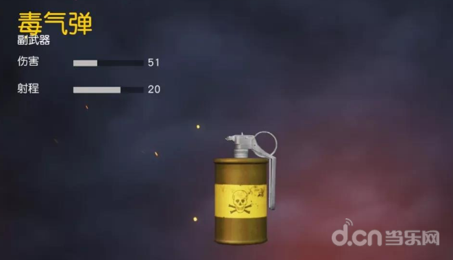 毒气弹的伤害值可达51,射程范围为20米。毒气弹的伤害虽然比不上手榴弹,但是它的烟雾覆盖范围比较广,发出的绿烟还可以阻挡对手视线,综合来说,是一款性能优良的投掷武器。毒气弹伤害范围