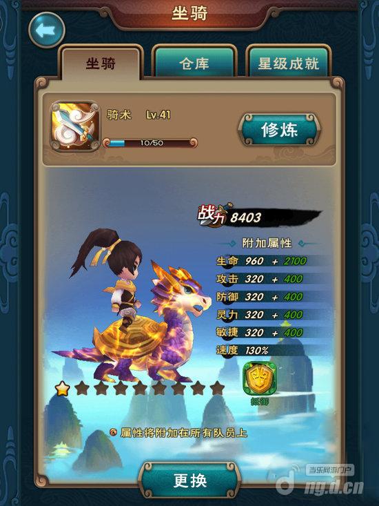 玄武坐骑外形呆萌可爱,用四只小短腿在地上跑。并且身上还是流光溢彩的特效哦!坐骑的属性是有骑术等级去决定的,所以所有坐骑属性是差不多的。不过坐骑的技能是不一样的,玄武的技能时全队增加防御,效果不错可以加强全队的生存能力。对于队伍防御不够的玩家们可以优先换出玄武使用。