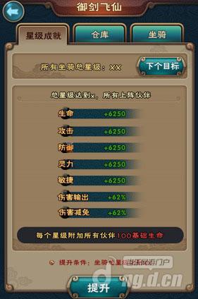 坐骑星级成就:根据所收集到的坐骑星级总和,即可在星级成就界面提升成就,从而加强所有上阵伙伴的各项属性值。