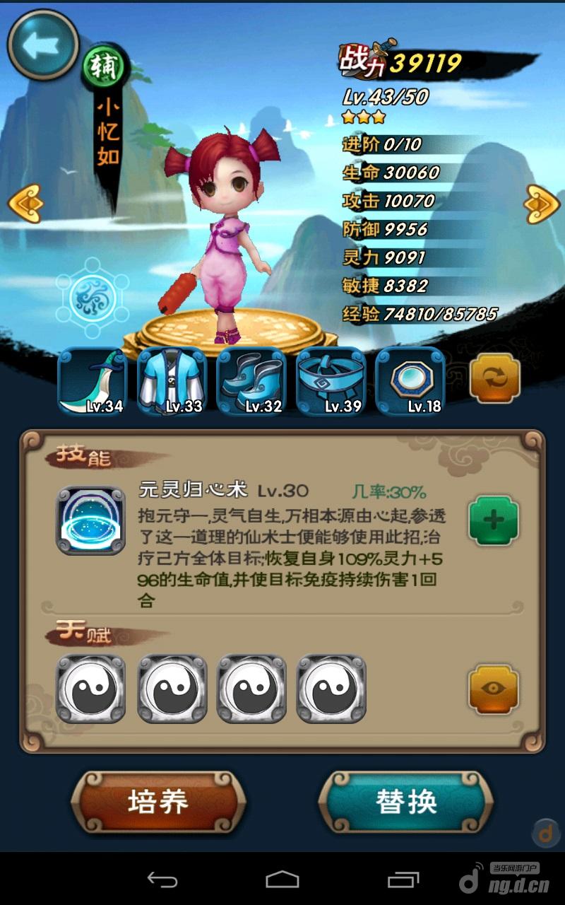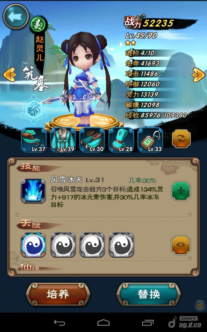 2、灵:建议可以选择灵儿,做为系统赠送的角色还免费赠送进阶,怎么着也要用,灵儿技能附带冰冻1回合效果,在实战中对手如果闪躲比自己低那很容易被冰冻,做为非V算是较强角色中不可缺少的伙伴了,目前露珠进阶到4,属性图如下