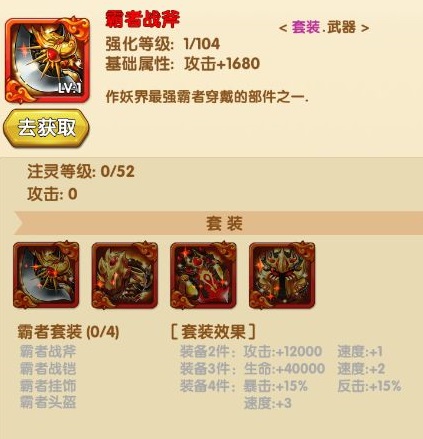 这个尤其适合走极限流的小伙伴,霸者套装每一件的单独属性相对而言不那么出众,但是集齐之后套装效果:暴击+15%,反击+15%,速度加3,非常及其的