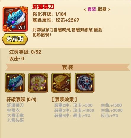 在新手阶段(副本没到十三章之前),可以去试炼商店换一把轩辕菜刀,一个大勇印。不要吝啬这么一点积分,没有这一套装备,会消耗更长的时间才能打到十三章,更不要说后面进阶了,根本没有材料。头盔60级会送一个,衣服在竞技商店换(开局就一直换,尽可能快的换到)。 然后新手时期这一套装备可以给主力武将如小沈阳(极限赵云也是可以的哦),直到换到霸者套装。 主公可能要问了:既然菜刀装是过渡期装备,是否需要加强呢?