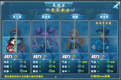 二、英雄冢:英雄冢即是NPC的卡片收集系统,总计有三个档次,每个档次有4个NPC。其中每个档次的第四个NPC为职业专属,即不同的职业第4个NPC是不同的。这些NPC的卡片可以通过击杀怪物和boss获得,也可以在市场上购买其他玩家寄售的卡片。卡片的品质有绿色,蓝色,紫色三种,品质越高,增加的战力越高,其中一个NPC的品质由其品质最低的碎片决定。