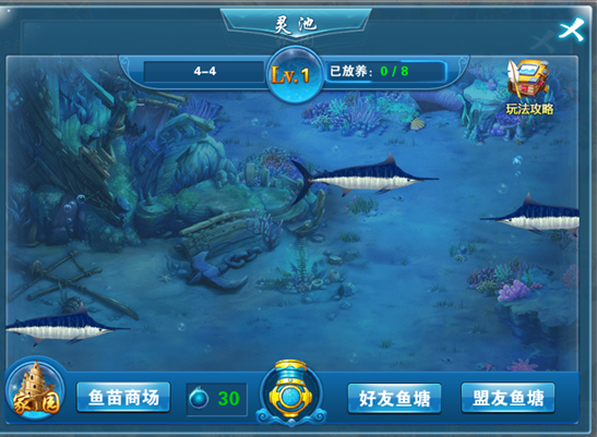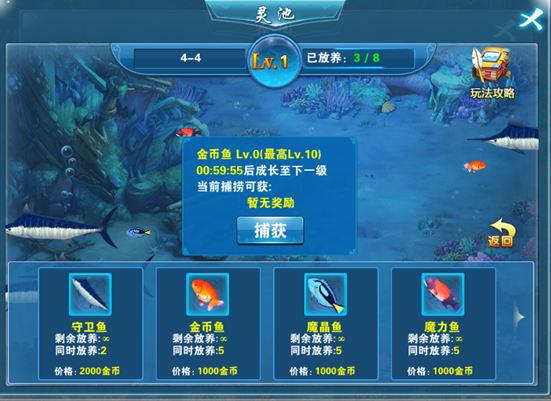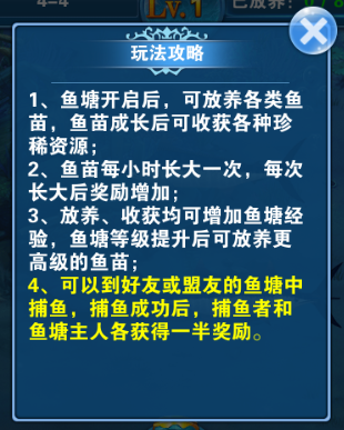 三、灵池:灵池是一个玩家养鱼的系统,鱼苗可以通过鱼苗商城购买。玩法介绍如下