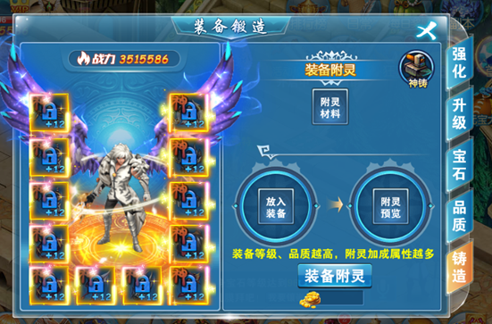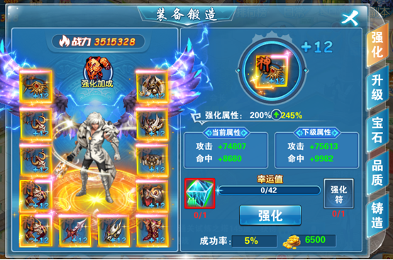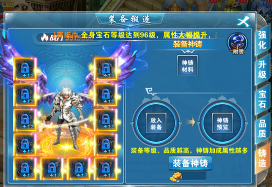 装备锻造分为强化、升级、宝石、品质、铸造等。