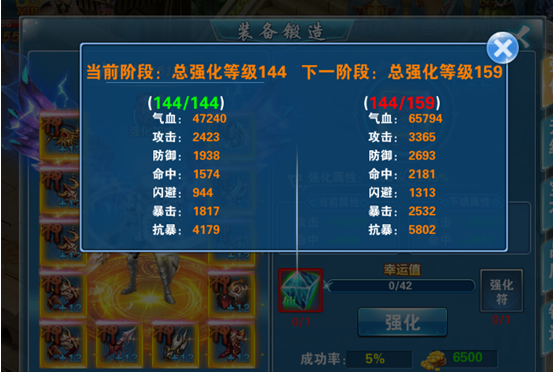 一、强化:消耗强化石对装备进行强化,强化失败的时候有概率会掉强化等级,使用强化符必定强化成功,并且强化到达一定等级时会有额外加成,强化石可通过商城购买