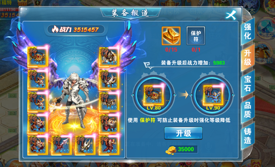 二、升级:消耗特定升级石对装备进行升级,升级石分为武器升级石和防具升级石。对装备进行升级的时候,有概率使装备的强化等级降低,使用保护符可避免这一情况。升级石可通过武器副本或者运营活动获得