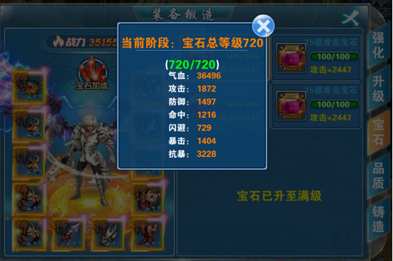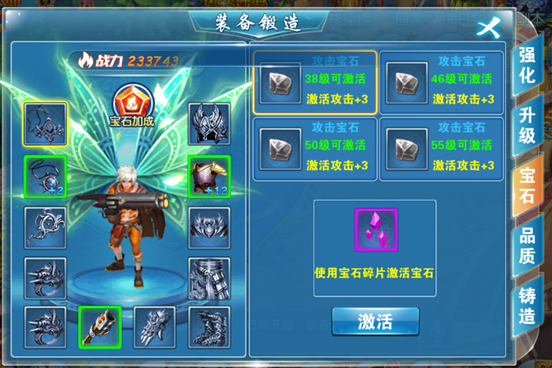 三、宝石:消耗宝石碎片对装备进行宝石升级,或者使用x级宝石直升一级。宝石碎片和X级宝石可通过运营活动或者寻宝获取。宝石达到指定等级额外有战力加成。