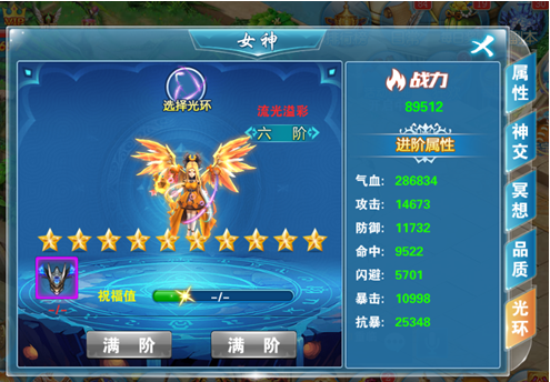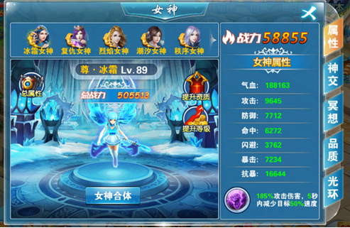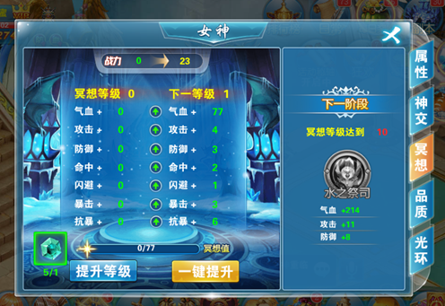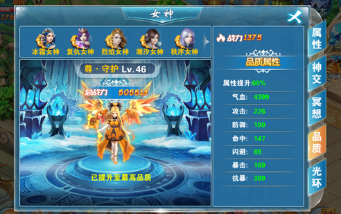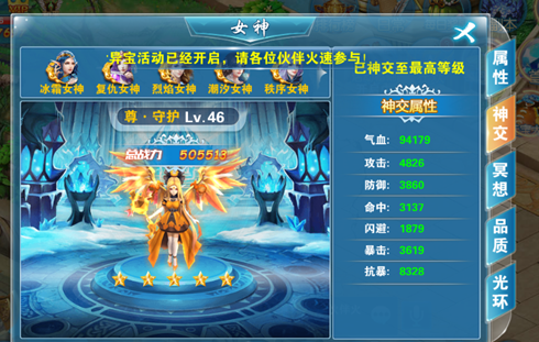 女神分为五个模块,分别是女神属性、女神神交、女神冥想、女神品质、女神光环