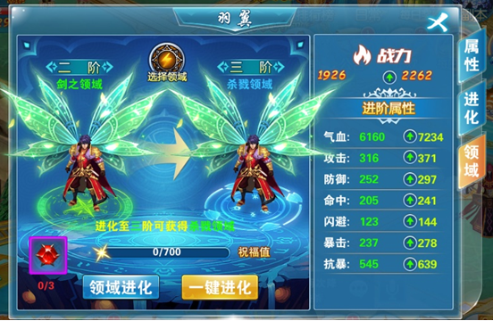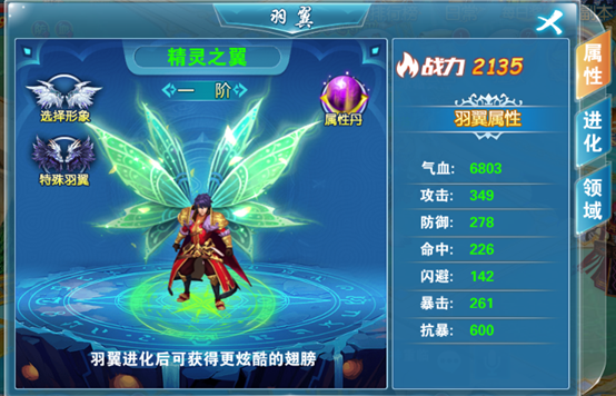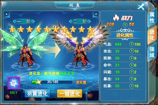 二、进化:羽翼总共有十阶,每阶有十颗星。每阶都有不同的羽翼形象,达到特定阶数即可激活。使用羽翼之魂可以提升羽翼的星数,羽翼之魂可以通过道具副本,商城,运营活动获得。进化面板的右侧则是羽翼进阶系统的战力。