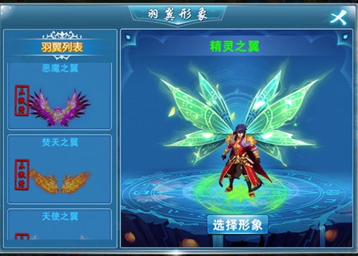 1.选择形象:在选择形象界面,可以查看所有羽翼形象,可以选择已拥有的羽翼形象。